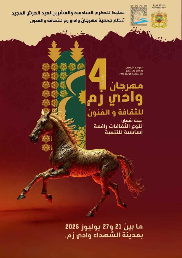 وادي زم ـ 28 ـ 04 ـ 2025 (اج) ـ ـ ـ عقدت جمعية مهرجان وادي زم للثقافة والفنون، امس الأحد 27 ابريل 2025، بدار الشباب 20 غشت، ندوة صحافية، قدمت فيها الخطوط العريضة لفعاليات الدورة الرابعة لمهرجان مدينة الشهداء وادي زم، والتي ستقام بمناسبة الذكرى 26 للاحتفال بعيد العرش المجيد من 21 الى 27 يوليوز2025.