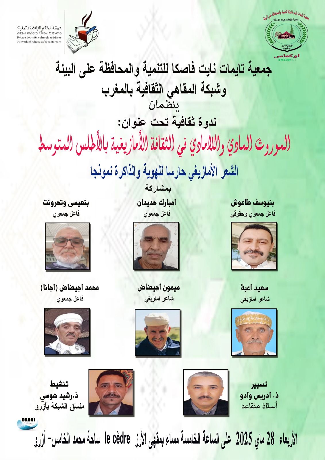 بتنسيق مع جمعية تايمات نايت فاصكا للتنمية والمحافظة على البيئة،تنظم الشبكة ندوة ثقافية تحت عنوان : الموروث المادي واللامادي في الثقافة الأمازيغية بالأطلس المتوسط ؛ الشعر الأمازيغي حارسا للهوية والذاكرة نموذجا ، وذلك بمشاركة الأساتذة والشعراء التالية أسماؤهم : بنيوسف طاعوش ،إدريس وادو ، امبارك حديدان ، بنعيسى وتحرونت ، سعيد أعبة ، ميمون أجيضاض و محمد أجيضاض (اجانا ) .