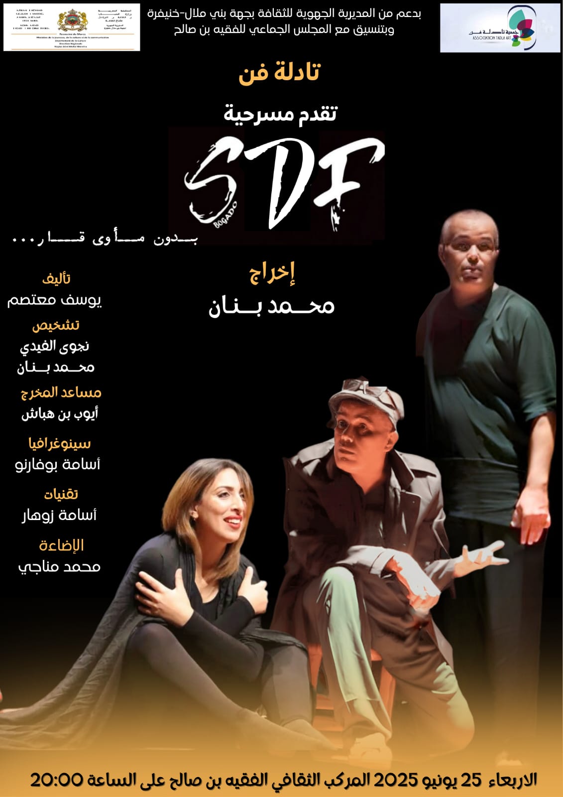 تقدم فرقة تادلة فن مسرحيتها الجديدة “أس دي اف”…بدون مأوى قار )، وهي من تأليف يوسف معتصم، وإخراج محمد بنان، وذلك يوم الأربعاء 25 يونيو 2025 على الساعة الثامنة مساء بقاعة المركب الثقافي الفقيه بن صالح، وذلك بدعم من المديرية الجهوية للثقافة بجهة بني ملال- خنيفرة وبتنسيق مع المجلس الجماعي للمدينة.