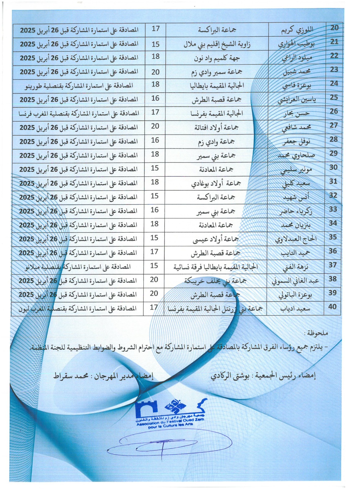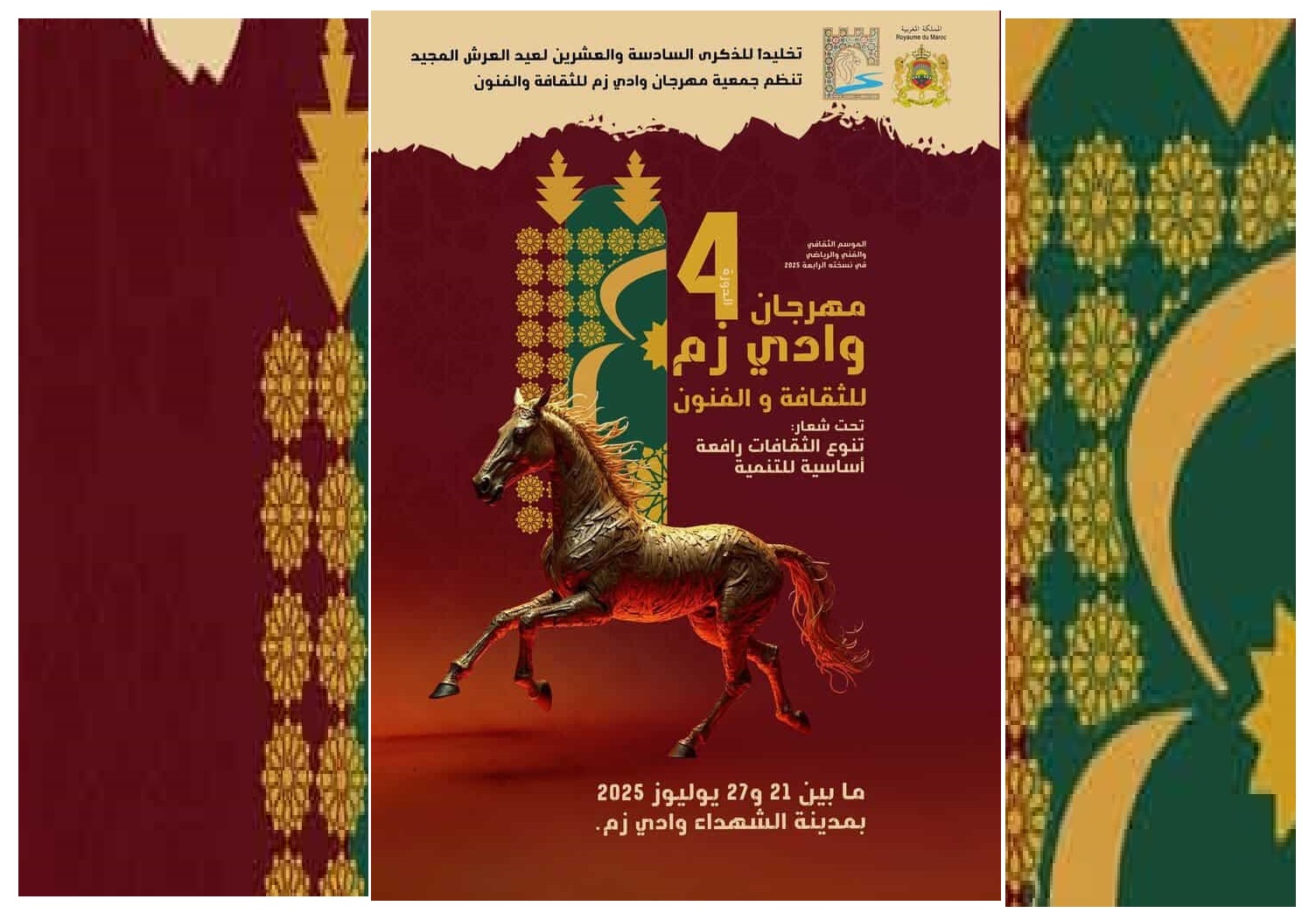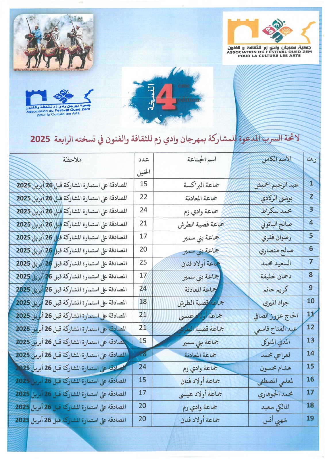 وادي زم ـ 30 ـ 06 ـ 2025ـ (اح) ـ ـ ـ كشفت إدارة مهرجان وادي زم للثقافة والفنون، عن اللائحة النهائية لفرق التبوريدة المشاركة في فقرات النسخة الرابعة من المهرجان، والتي ستنظم من 21 إلى 27 يوليوز  2025، بمناسبة الذكرى 26 لعيد العرش المجيد، تحت شعار “تعدد الثقافات رافعة أساسية للتنمية”.
