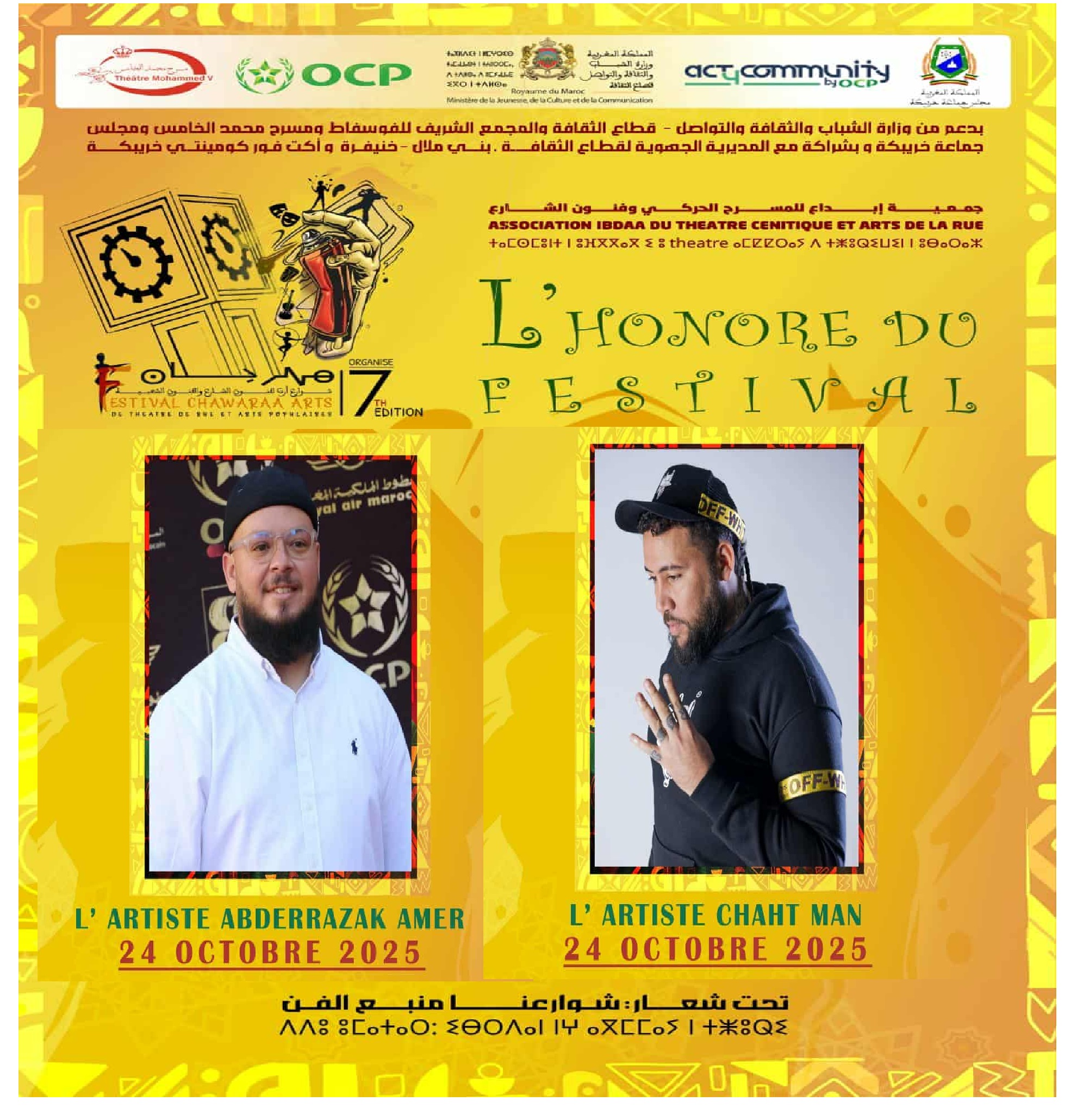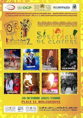 فقرات الدورة، التي تقام تحت شعارٍ “شوارعنا منبع الفن” بدعم من وزارة الشباب والثقافة والتواصل – قطاع الثقافة، والمجمع الشريف للفوسفاط، ومسرح محمد الخامس، ومجلس جماعة خريبكة، إلى جانب شراكات ثقافية ومؤسساتية متعددة، منها المديرية الجهوية لقطاع الثقافة بجهة بني ملال خنيفرة، و”اكت فور كومينوتي خريكبة”، والخزانة الوسائطية (م.ش.ف)، والمديريتان الإقليميتان للثقافة والشباب بخريبكة، ستشمل مزيجا خصبا من المسرح والسيرك، وعروض غرافيتي، ورسم جداريات، وتنشيط أطفال، فضلا عن عروض لمسرح الشارع وغيره.