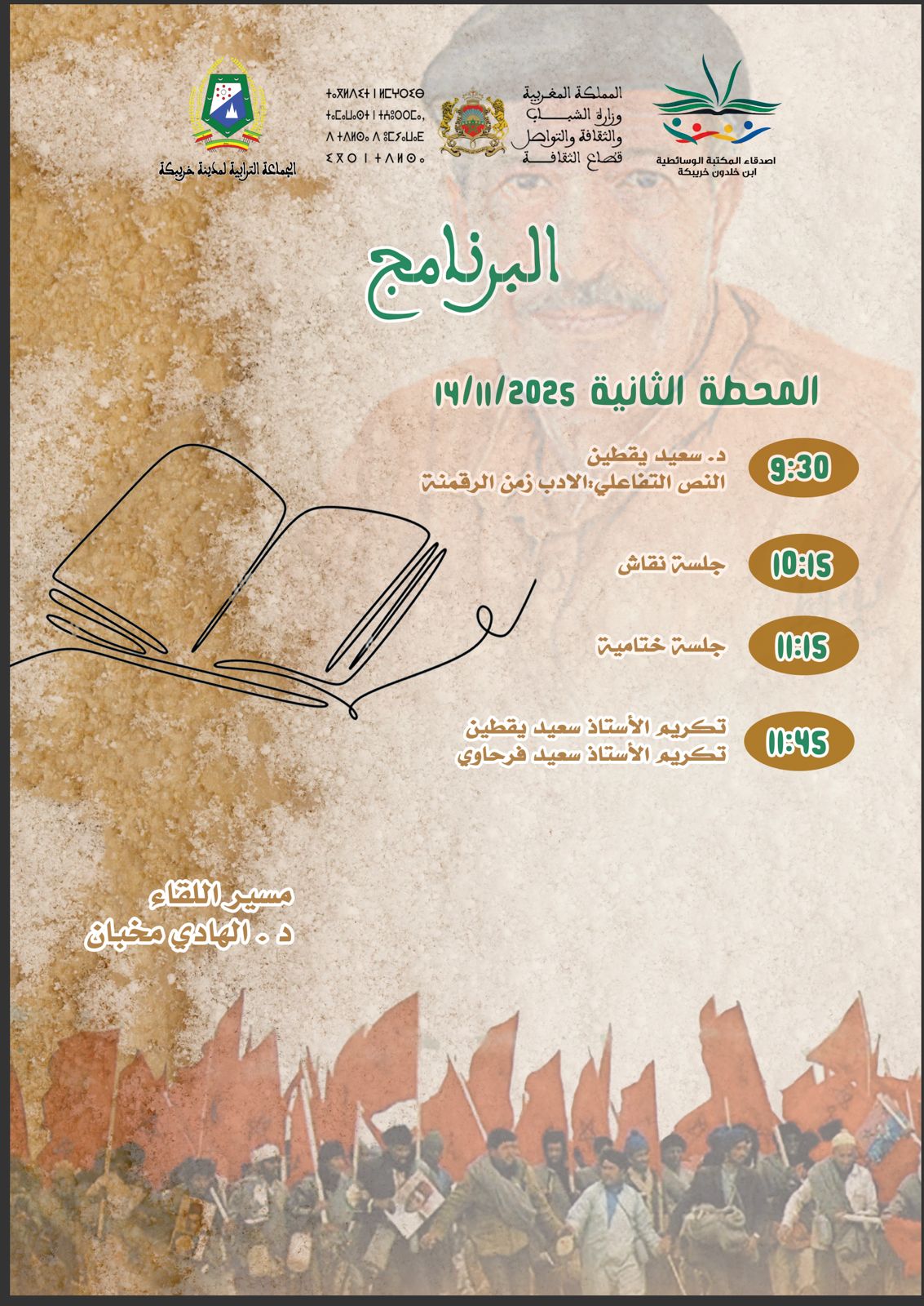 أما اليوم الثاني من الملتقى، الجمعة 14 نونبر، فيتضمن جلسة فكرية بعنوان «سعيد يقطين: النص التفاعلي، الأدب والرقمنة»، ضمن المحطة الثانية، يليها نقاش مفتوح مع الباحثين والمشاركين، ليُختتم اللقاء بتكريم كل من الدكتور سعيد يقطين والدكتور سعيد فرحاوي، اعترافاً بإسهامهما في ترسيخ الدرس النقدي المغربي وإغناء الحقل الثقافي العربي.